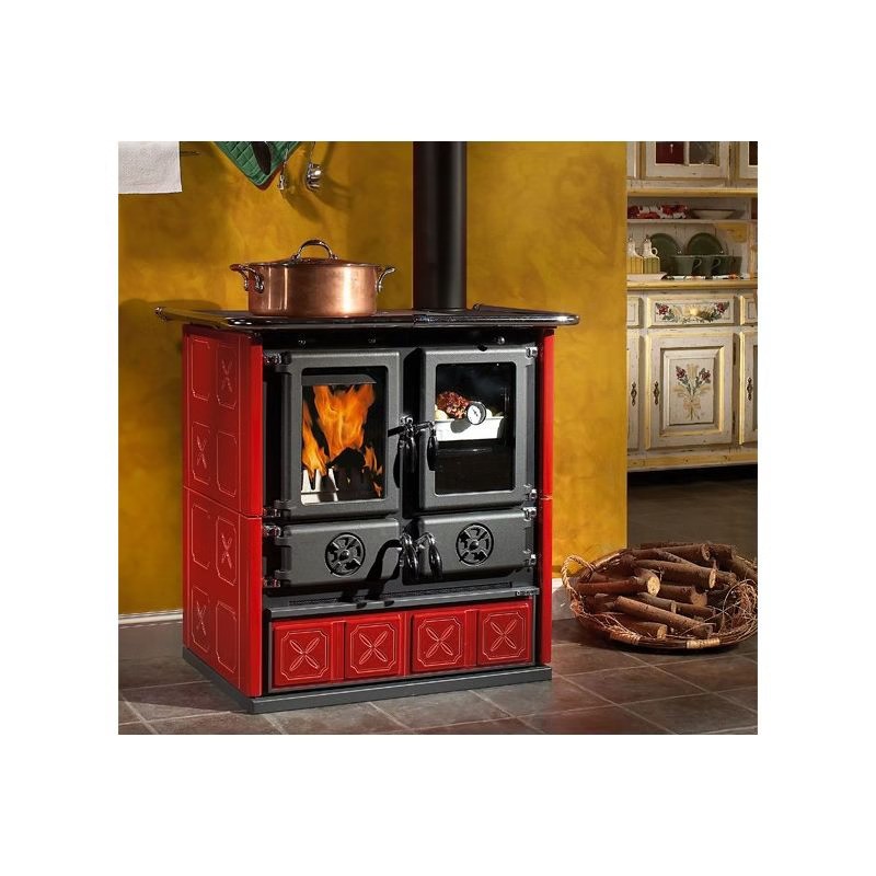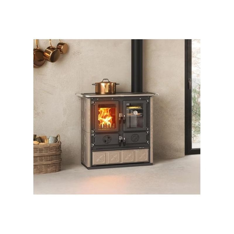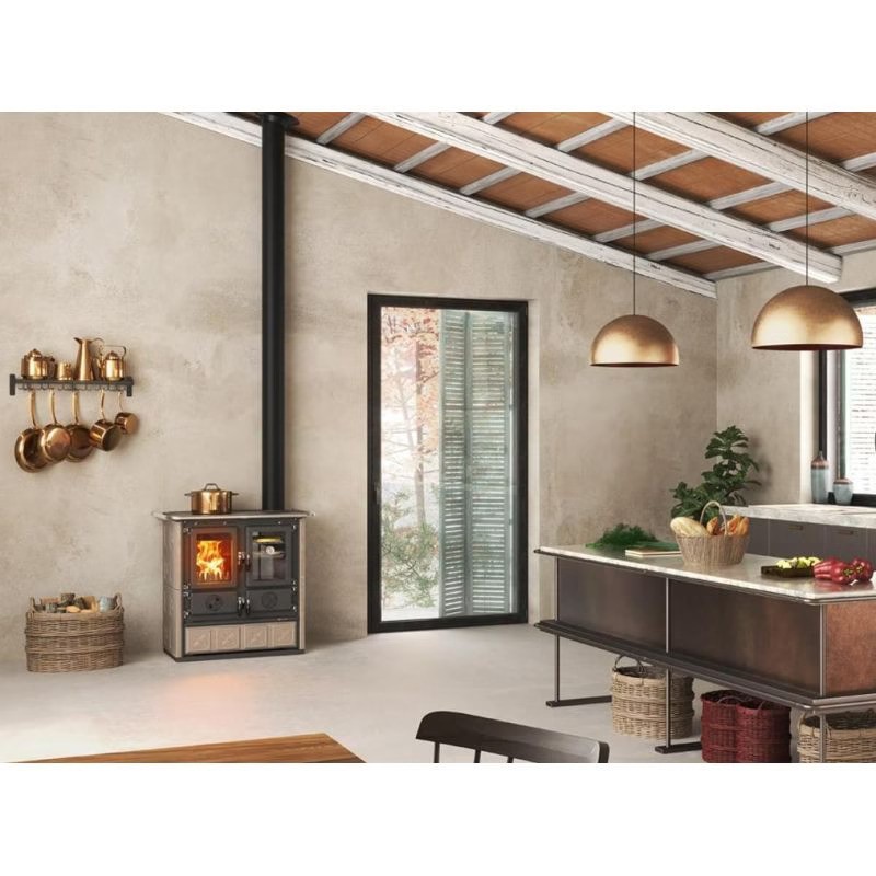 La stufa a legna LA NORDICA Rosetta 5.0 Maiolica combina tradizione, efficienza e versatilità per offrire una soluzione completa di riscaldamento e cottura. Con una potenza nominale di 7,9 kW, è in grado di riscaldare fino a 226 m³, ideale per cucine, soggiorni o ambienti di medie dimensioni.