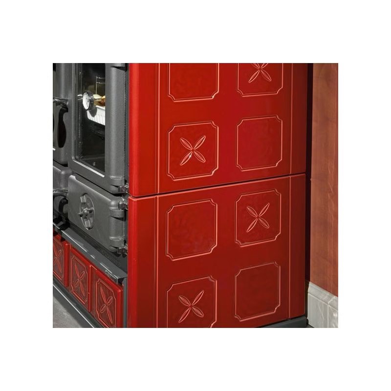 Il forno integrato da 28 L permette di preparare piatti con il gusto autentico della legna. Il rivestimento in maiolica di alta qualità e la struttura in ghisa garantiscono durata, accumulo di calore e diffusione uniforme della temperatura. La stufa dispone di doppia regolazione dell’aria (primaria e secondaria) per ottimizzare la combustione e ridurre i consumi.